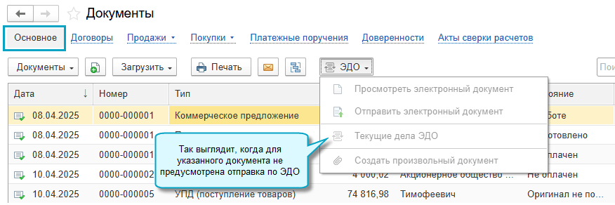 Добавлена возможность отправлять документы по ЭДО из общего списка документов в простом интерфейсе.