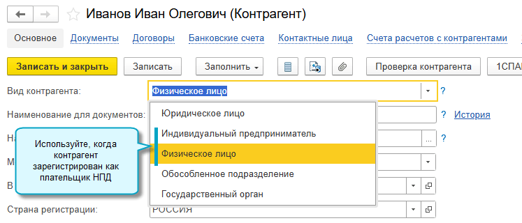 Уточнен перечень видов контрагентов. Вместо вида контрагента "Самозанятый" используйте "Индивидуальный предприниматель" или "Физическое лицо" в зависимости от статуса физического лица. Если поставщик уплачивает налог на профессиональный доход (НПД), то укажите это в договоре.