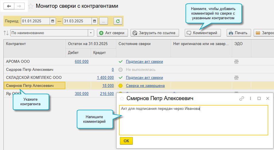 Теперь можно добавлять комментарий по контрагенту в мониторе сверки.