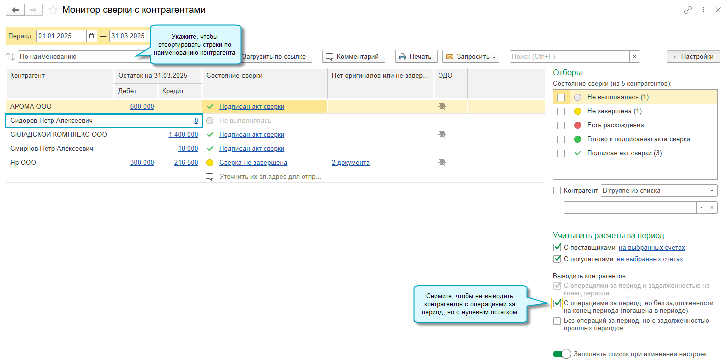 Полный интерфейс: меню "Продажи или Покупки - Расчеты с контрагентами - Монитор сверки с контрагентами".