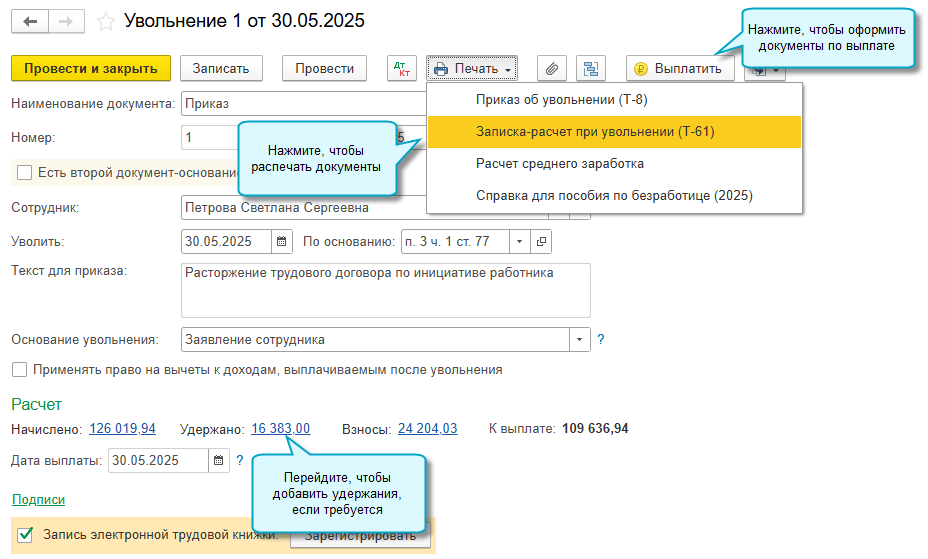 Для этого в документ "Увольнение" добавлен расчет компенсации и зарплаты. Кроме приказа об увольнении теперь можно распечатать еще записку-расчет при увольнении и расчет среднего заработка.