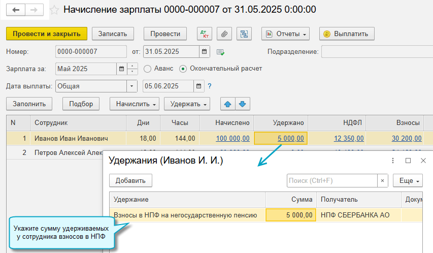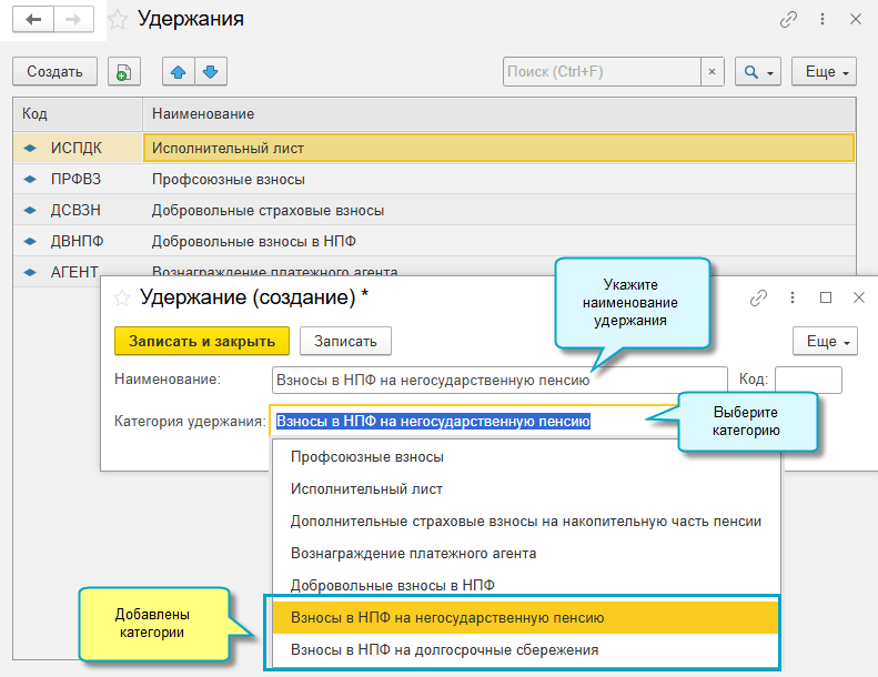 Перед этим потребуется только добавить виды удержаний с категориями "Взносы в НПФ на негосударственную пенсию" (соответствует коду вычета 515) и "Взносы в НПФ на долгосрочные сбережения" (516).