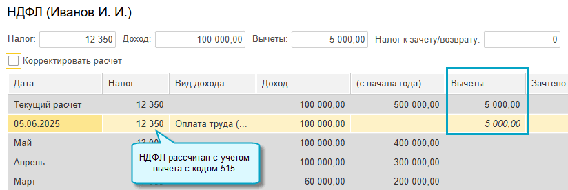 Теперь, чтобы рассчитать НДФЛ с учетом вычетов на долгосрочные сбережения граждан с кодами 515 и 516, достаточно указать сумму удержанных взносов в документе "Начисление зарплаты".