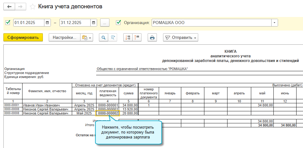 Простой интерфейс: меню "Сотрудники - Основное - Отчеты - Все отчеты - Книга учета депонентов".