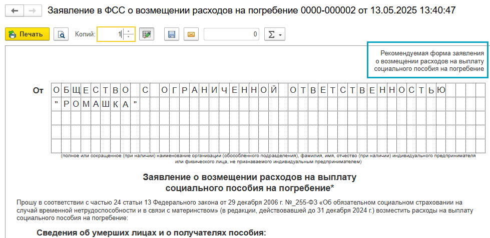 Обновлена печатная форма заявления о возмещении расходов на выплату социального пособия на погребение. Она применяется при обращении организации в СФР после 1 января 2025 г. по возмещению расходов, произведенных до 31 декабря 2024 г. (включительно).