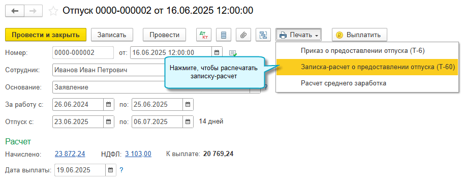 Добавлена возможность распечатать записку-расчет о предоставлении отпуска.