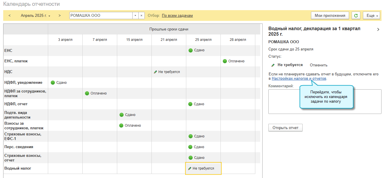 Теперь удобнее управлять набором задач по налогам в календаре отчетности. Добавлена возможность из календаря отчетности перейти к настройке налогов и отчетов. После изменения настроек календарь автоматически обновляется.