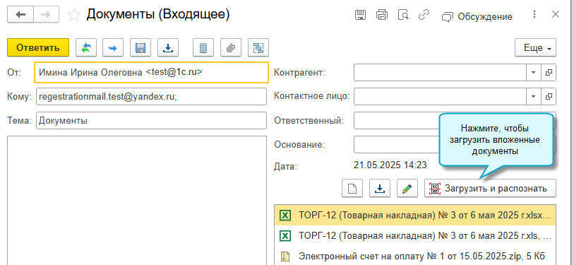 Из входящих писем, которые используются, когда включена функциональность "Взаимодействие с лидами и покупателями", теперь также можно передавать файлы на распознавание через сервис 1С:РПД.