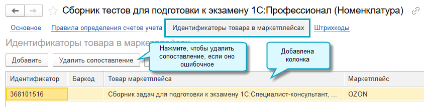 Теперь можно увидеть, с какими товарами на маркетплейсе сопоставлена номенклатура в программе. Для этого добавлена колонка "Товар маркетплейса".
