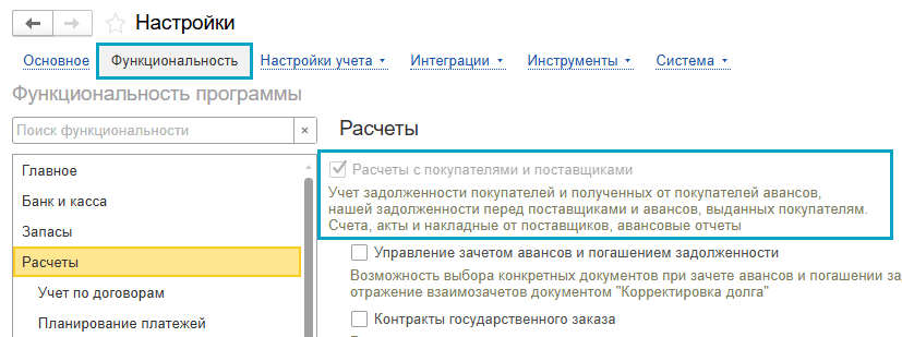 Включен учет расчетов с покупателями и поставщиками в Функциональности программы для тех организаций, уплачивающих НДС при УСН "доходы", кто не включил его ранее самостоятельно. Это требуется, чтобы указывать НДС в документах, отражать в учете продажу товаров, работ и услуг, выставлять покупателям счета-фактуры, в том числе на аванс.