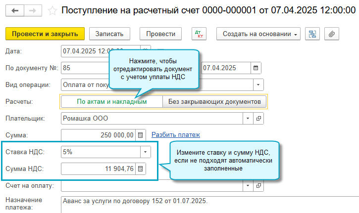 1. Отредактировать перечисленные документы - установить в них переключатель Расчеты в положение "По актам и накладным" и указать ставку НДС и сумму НДС