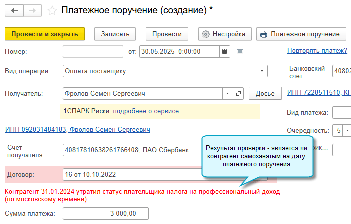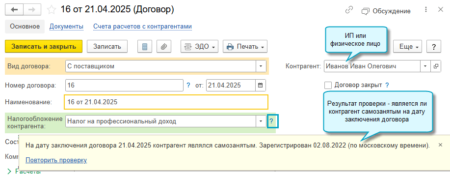 Теперь и в локальных (коробочных) версиях автоматически проверяется статус самозанятых контрагентов по данным ФНС при оформлении первичных документов с ними. Это позволяет своевременно подтвердить их актуальный статус и избежать налоговых рисков, связанных с ошибочным оформлением выплат в адрес физических лиц, утративших статус.