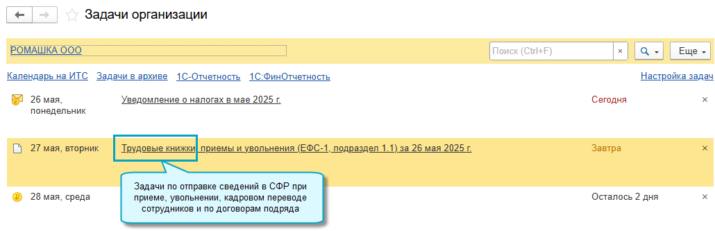 Переименованы задачи организации по их отправке в списке задач и в календаре отчетности. Теперь их наименование начинается с "Трудовые книжки...".