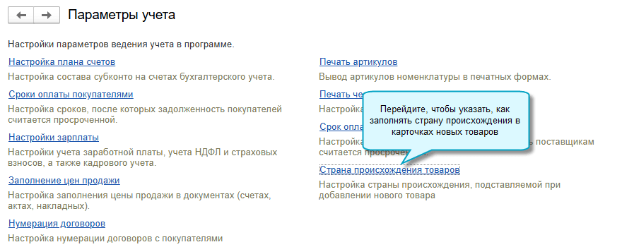 Полный интерфейс: меню "Администрирование - Настройки программы - Параметры учета - Страна происхождения товаров".