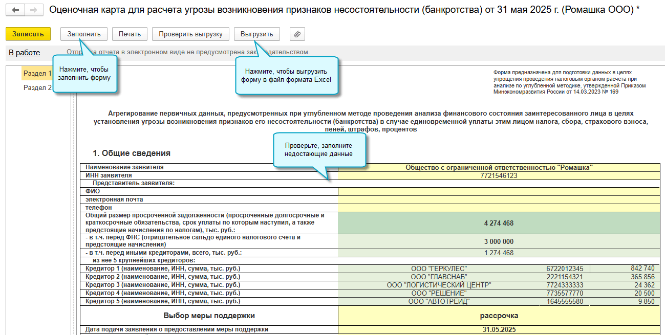 Добавлено автозаполнение Оценочной карты для расчета угрозы возникновения признаков несостоятельности (банкротства). Подробнее о порядке заполнения см. здесь. Форму можно выгрузить в файл формата Excel.