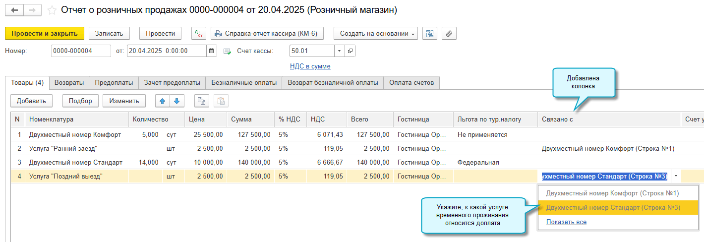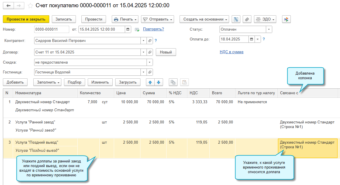 При расчете налога доплата за ранний заезд или поздний выезд суммируется со стоимостью основной услуги по временному проживанию (Письмо ФНС от 08.04.2025 № СД-4-3/3704@). Подробнее ...