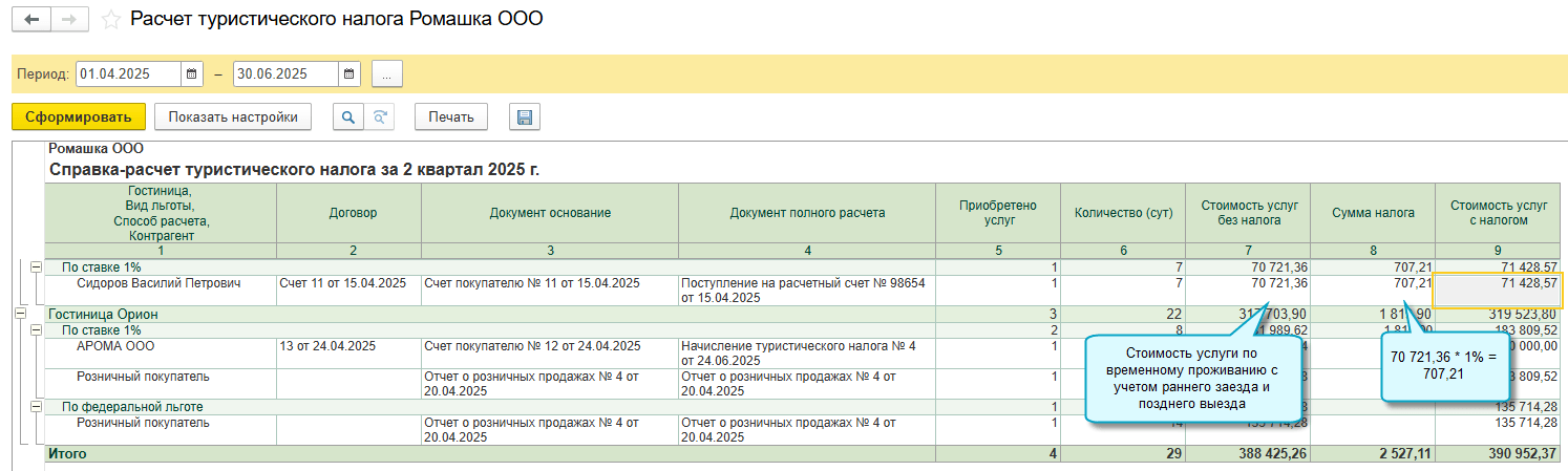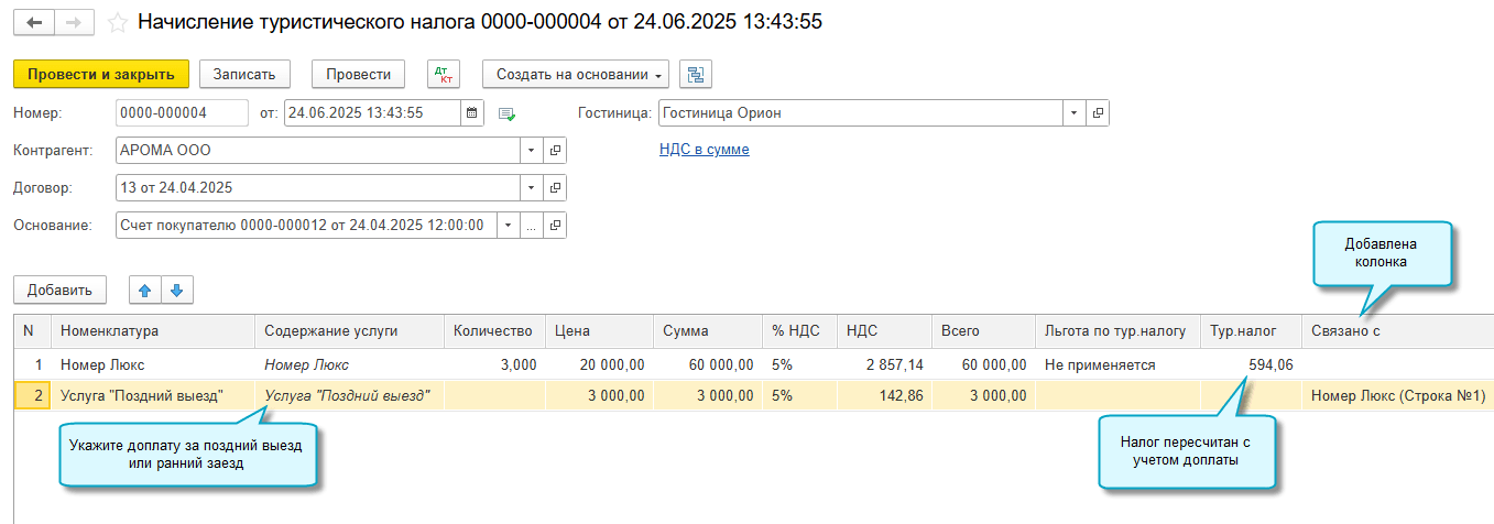 Добавлена возможность рассчитать туристический налог, когда отдельно от услуги временного проживания за сутки оплачивается ранний заезд или поздний выезд.
