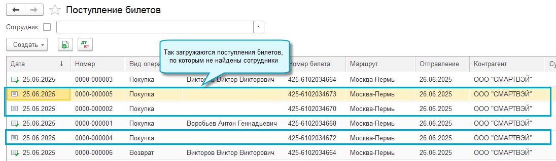 Добавлена возможность отключить автоматическое создание новых сотрудников при загрузке билетов из сервиса Smartway. Если при загрузке сотрудник не будет найден, то он не заполняется в билете и документ поступления билета не проводится. Это может пригодиться, когда часто билеты приобретаются до трудоустройства новых сотрудников.