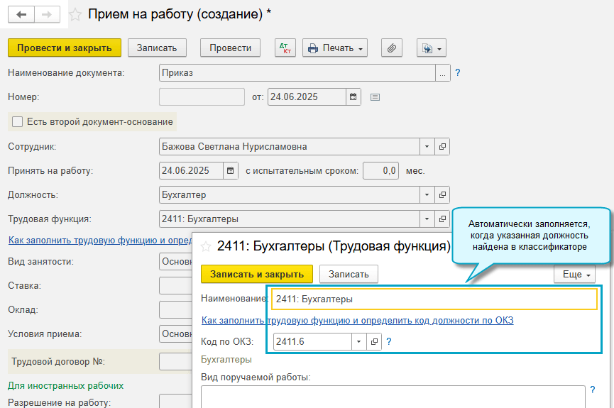 Можно заполнить автоматически трудовую функцию по должности, если ее наименование совпадает с наименованием профессии, должности по ОКПДТР.