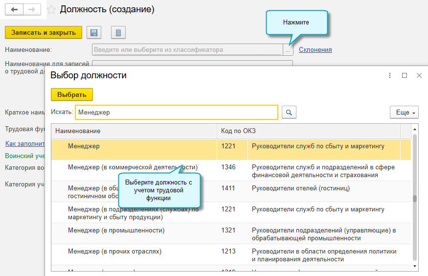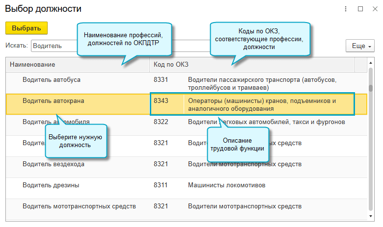 Добавлена возможность выбрать должность с соответствующей трудовой функцией по классификатору.