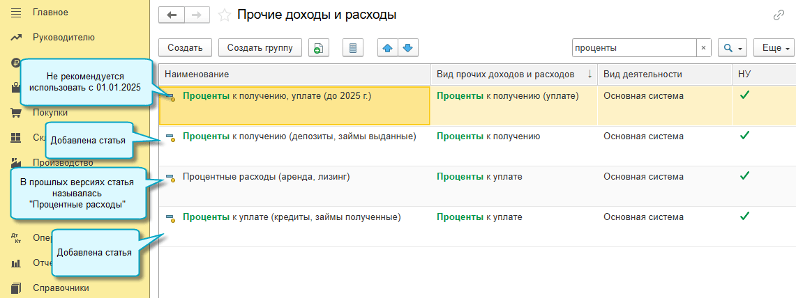 Расширен перечень статей, используемых для учета процентных доходов и расходов. С 01.01.2025 проценты рекомендуется отражать по новым статьям и видам "Проценты к уплате" и "Проценты к получению". Это позволит более точно применить требования ФСБУ 4/2023 при заполнении бухгалтерской отчетности.