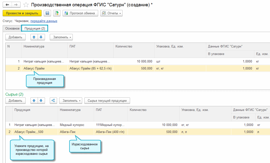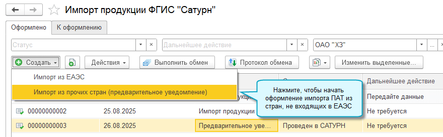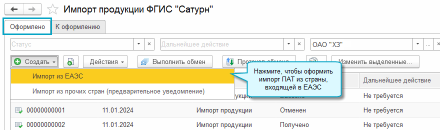 При импорте из стран ЕАЭС требуется оформить только документ "Импорт продукции из ЕАЭС", описать в нем ПАТ, откуда и как товар был ввезен. После его проведения во ФГИС "Сатурн" ввезенные партии попадают на остатки склада.
