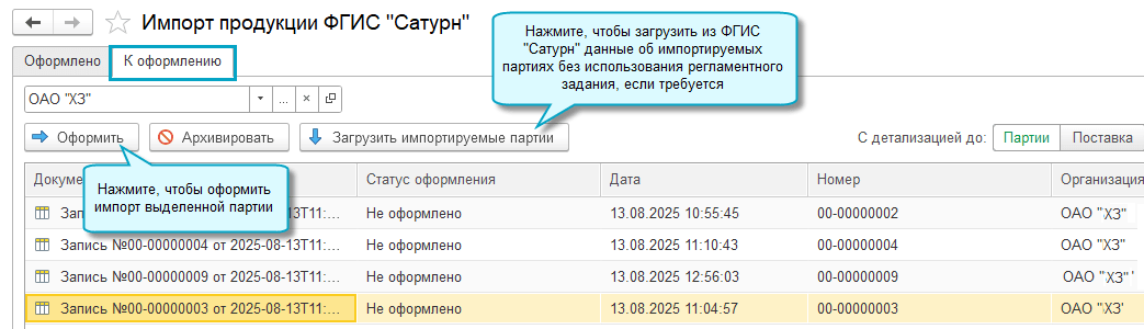 3. оформить документ "Импорт продукции" на загруженную партию. После его проведения во ФГИС "Сатурн" ввезенные партии попадают на остатки склада.