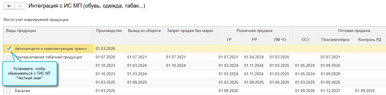 Добавлена возможность интеграции с ГИС МТ "Честный знак" по обороту товаров из группы Автозапчасти и комплектующие транспортных средств. Маркировка ведется в порядке эксперимента до 28 февраля 2026 года (Постановление Правительства РФ от 22.02.2025 № 202).