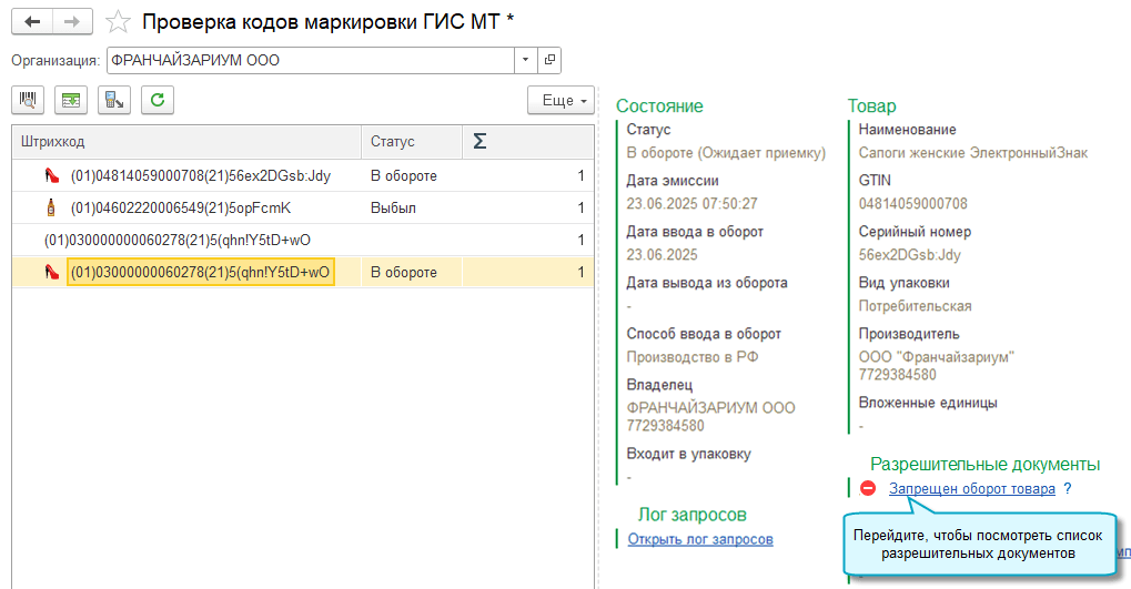 Чтобы посмотреть список всех РД по товару, требуется перейти в рабочее место "Проверка кодов маркировки ГИС МТ", в котором теперь выводится раздел "Разрешительные документы" с итоговым статусом проверки РД: