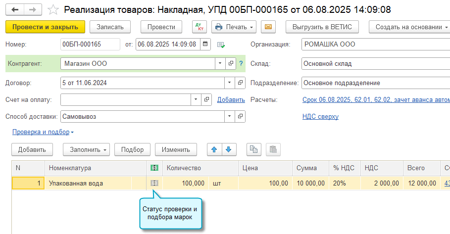 При добавлении кода маркировки в документ реализации будет выведено предупреждение о некорректном результате проверки РД, если наступила дата контроля РД по товарной группе и нет РД в подходящем статусе.