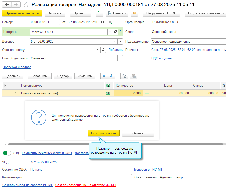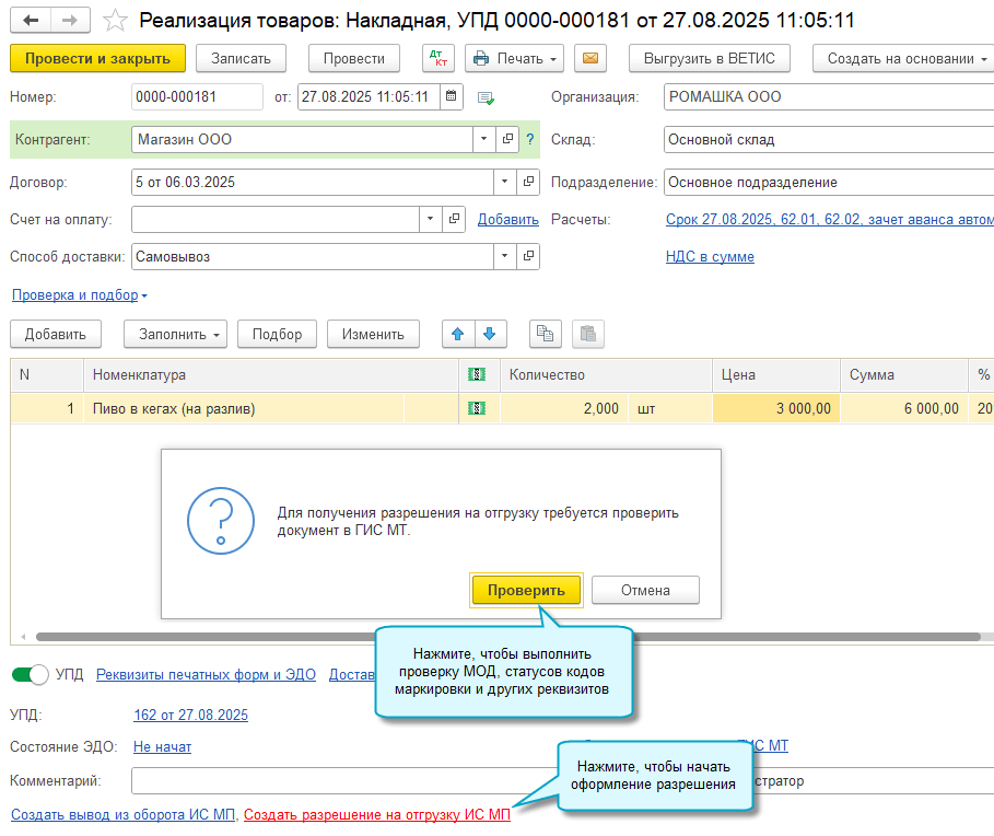 Теперь перед созданием разрешения на отгрузку пивной продукции требуется выполнить предварительную проверку в ГИС МТ мест осуществления деятельности (МОД), статусов кодов маркировки и других реквизитов.