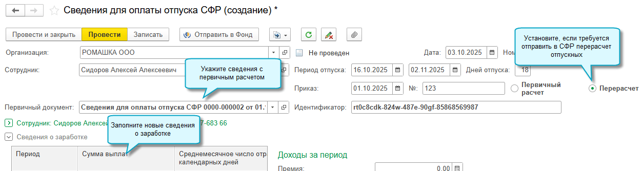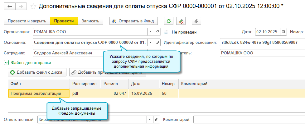 Если по результату рассмотрения Фондом сведений для оплаты отпуска требуется отправить недостающие сведения, используйте документ "Дополнительные сведения для оплаты отпуска СФР".