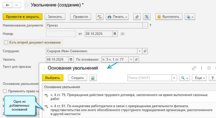 Простой интерфейс: меню "Сотрудники - Кадры или Начисления - Увольнение".