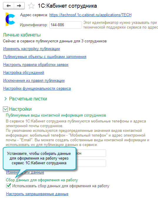 Теперь выполнить настройки функциональности сервиса 1С:Кабинет сотрудник можно не открывая сам сервис.