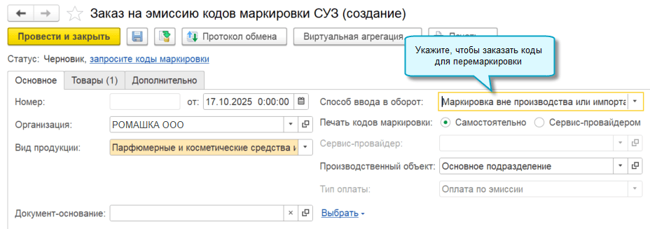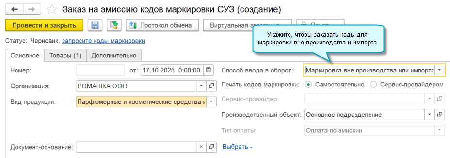 Добавлена возможность заказать коды маркировки со способом ввода в оборот "Маркировка вне производства или импорта".