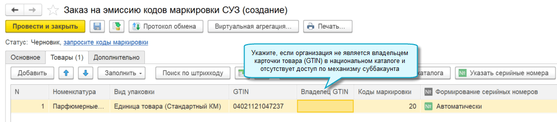 Коды маркировки можно заказать только для потребительских упаковок и с типом оплаты "Оплата по эмиссии".