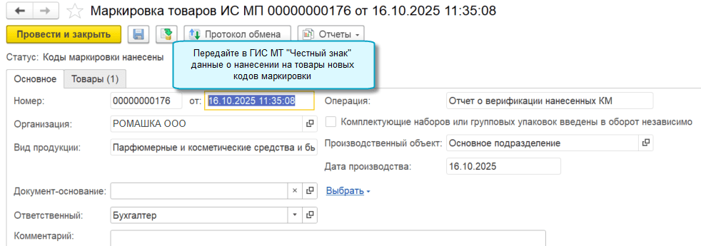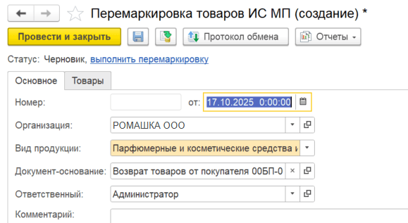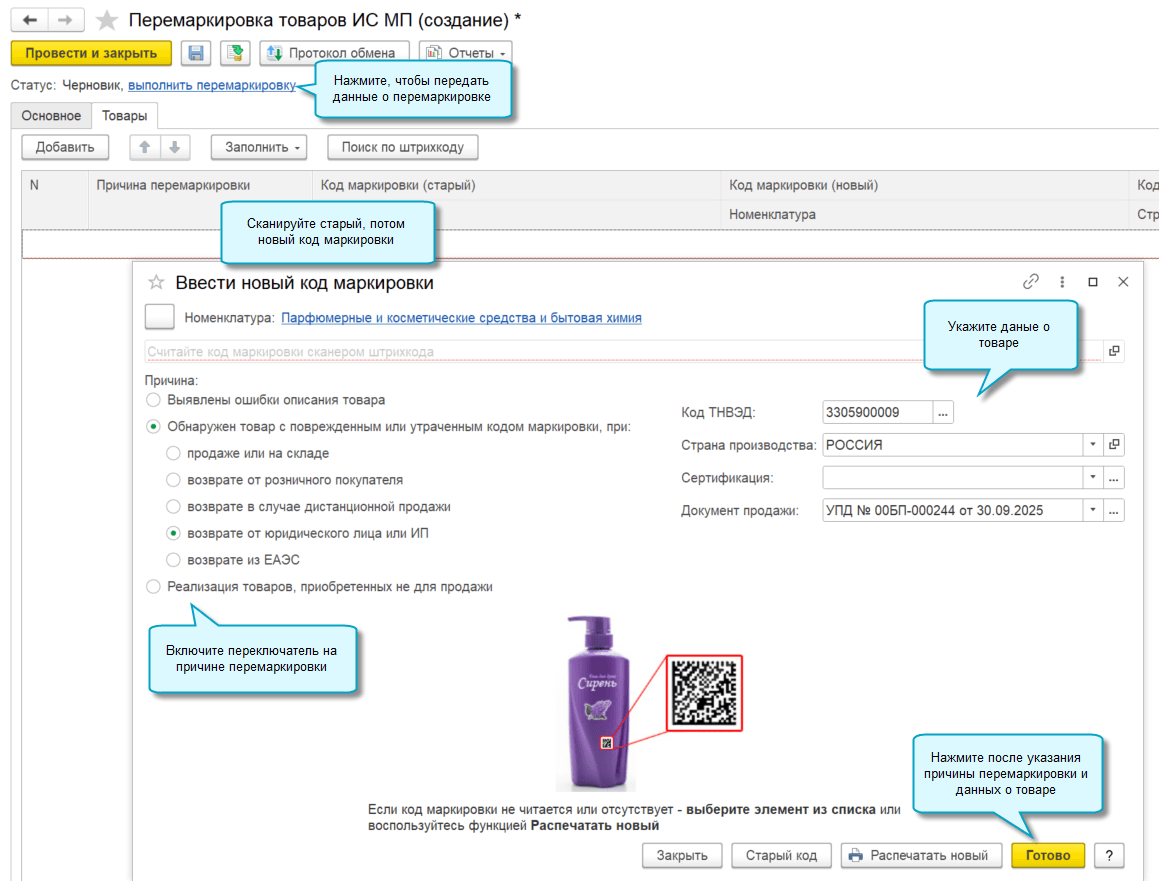 Добавлена возможность выполнить перемаркировку товаров из группы Парфюмерные и косметические средства и бытовая химия. Новый код маркировки должен быть эмитирован со способом ввода в оборот "Маркировка вне производства или импорта", при перемаркировке иметь статус "Нанесен".