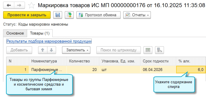 Добавлена возможность указать сведения о доле спирта при маркировке товаров из группы Парфюмерные и косметические средства и бытовая химия.