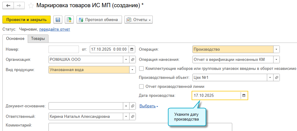Добавлена возможность указать дату производства при маркировке товаров из группы Упакованная вода.