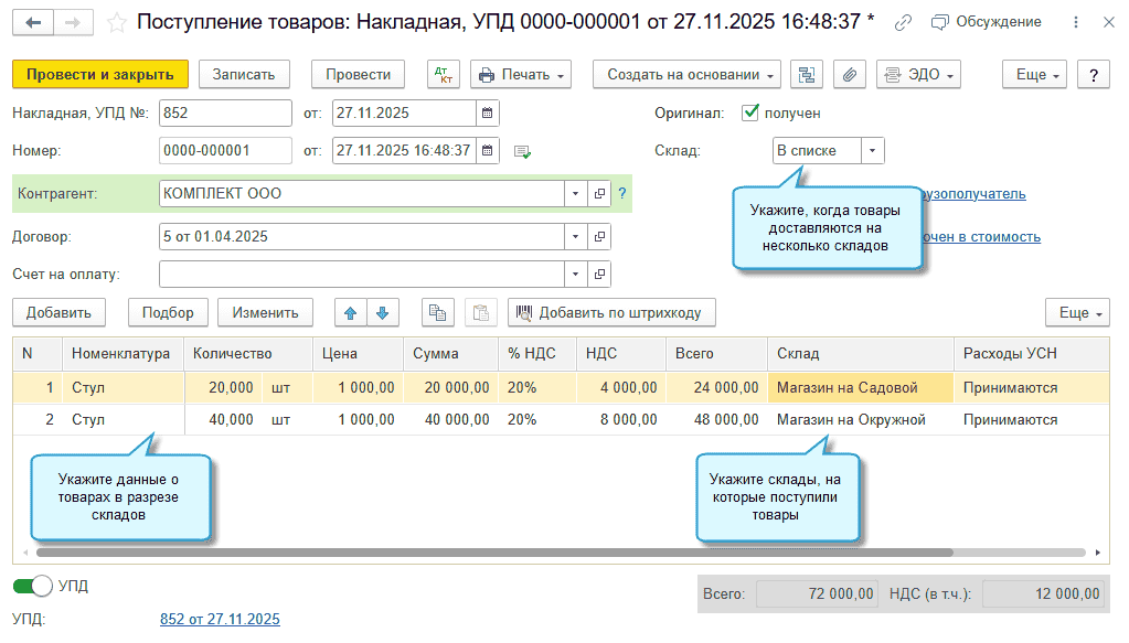 Добавлена возможность использовать один документ поступления товаров в тех случаях, когда поставщик выдает один УПД (накладную), а организация оформляет несколько Приходных ордеров (М-4), потому что товары поступают на несколько разных складов. Теперь для отражения таких ситуаций не требуется проводить дополнительные перемещения товаров между складами.