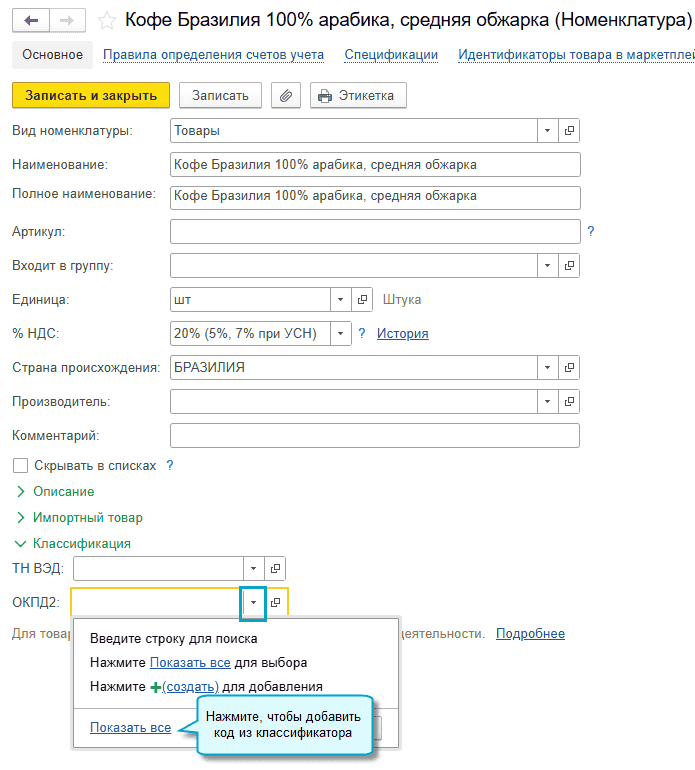 Теперь заполнение кодов по Общероссийскому классификатору продукции по видам экономической деятельности (ОКПД2) доступно для всех конфигураций 1С:Бухгалтерии предприятия, а не только КОРП.