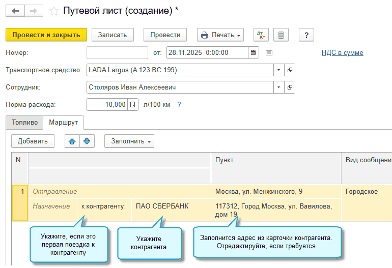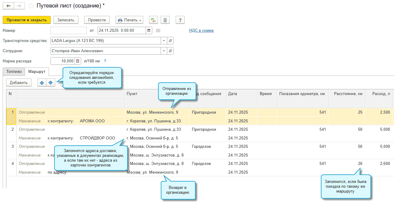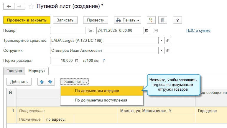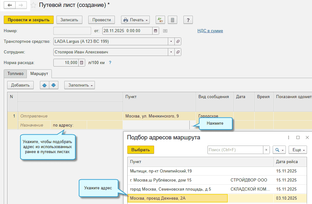 Добавлена возможность подбирать адреса отправления и назначения в путевых листах: