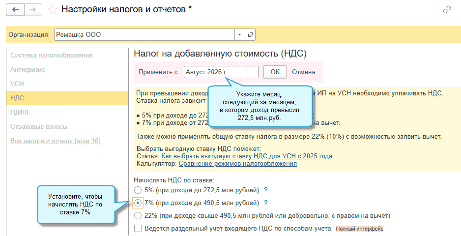 Полный интерфейс: меню "Главное - Настройки - Налоги и отчеты - НДС".