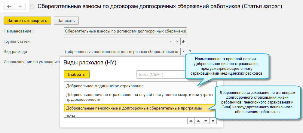 Используйте вид расходов "Добровольные пенсионные и долгосрочные сберегательные программы" для затрат на добровольное страхование по договорам долгосрочного страхования жизни работников, пенсионного страхования и (или) негосударственного пенсионного обеспечения работников, а с 01.01.2025 и для сберегательных взносов организации по договорам долгосрочных сбережений работников.