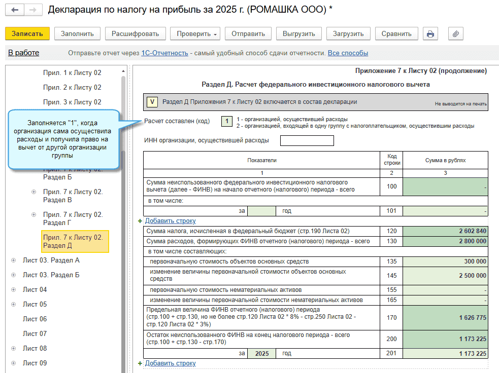 Скорректирован порядок заполнения Приложения 7 к Листу 02 декларации по налогу на прибыль "Раздел Д. Расчет федерального инвестиционного налогового вычета". Изменения действуют с 01.01.2026 начиная с декларации за 2025 год (Приказ ФНС России от 03.10.2025 № ЕД-7-3/855@). Подробнее ...