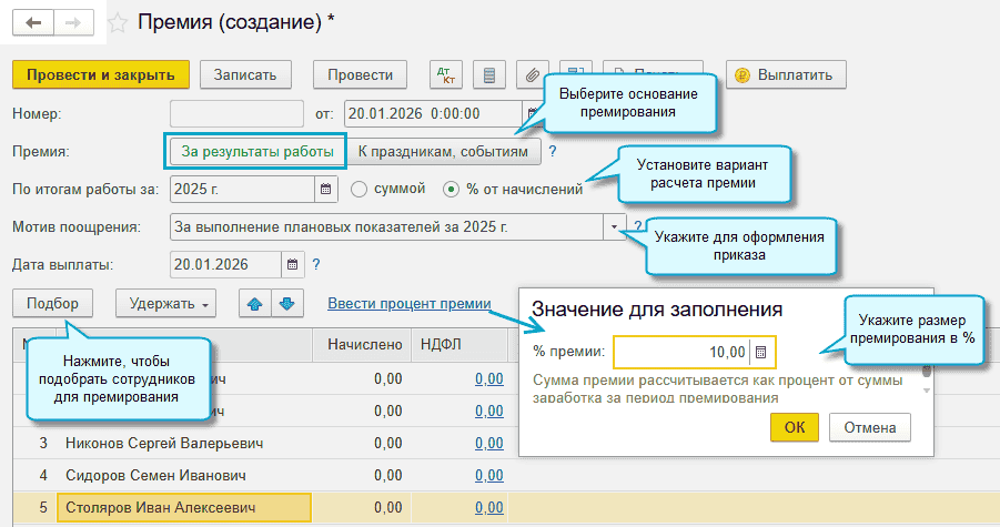 Добавлен специальный документ для начисления премий и печати приказов о поощрении.