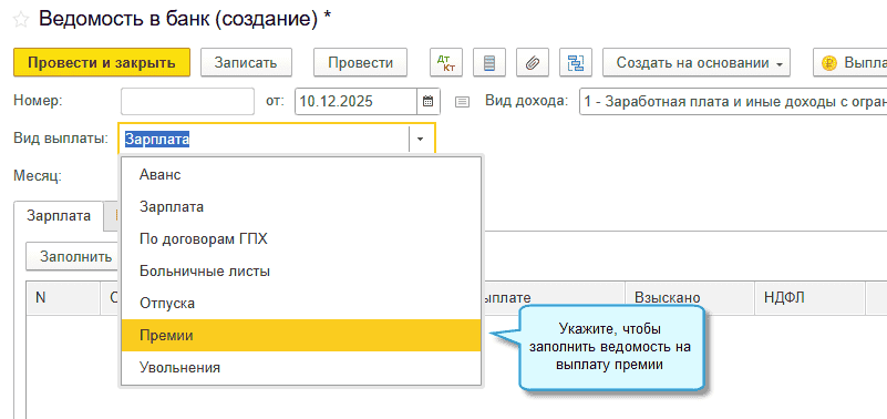 Добавлена возможность автоматически заполнить ведомости на выплату больничных, отпускных, премий и расчета при увольнении, когда они выплачиваются отдельно от зарплаты.