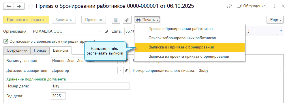Добавлена возможность распечатать отдельные выписки из приказа о бронировании по военкоматам по местам учета сотрудников (Постановление МВК от 18.06.2025 № 4пр-МВК).