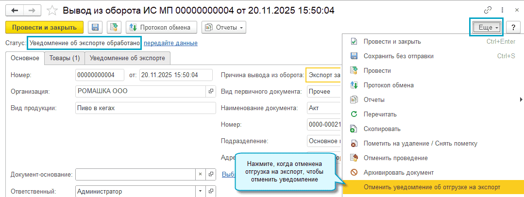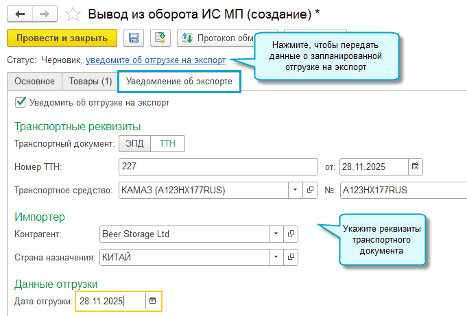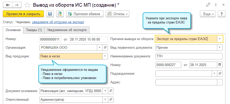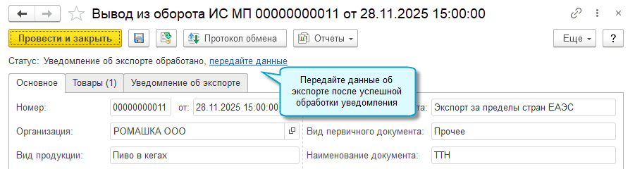 Поддержана передача уведомления об отгрузке на экспорт при отгрузке пива в страны ЕАЭС и за пределы ЕАЭС (аналог разрешения на отгрузку по внутренним продажам).