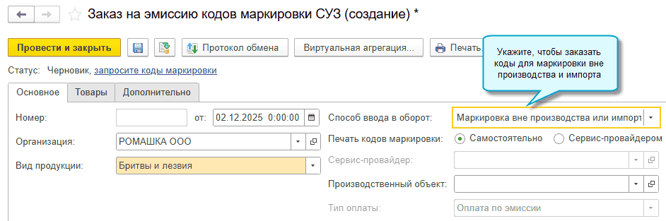 Добавлена возможность заказать коды маркировки со способом ввода в оборот "Маркировка вне производства или импорта" для товарных групп: